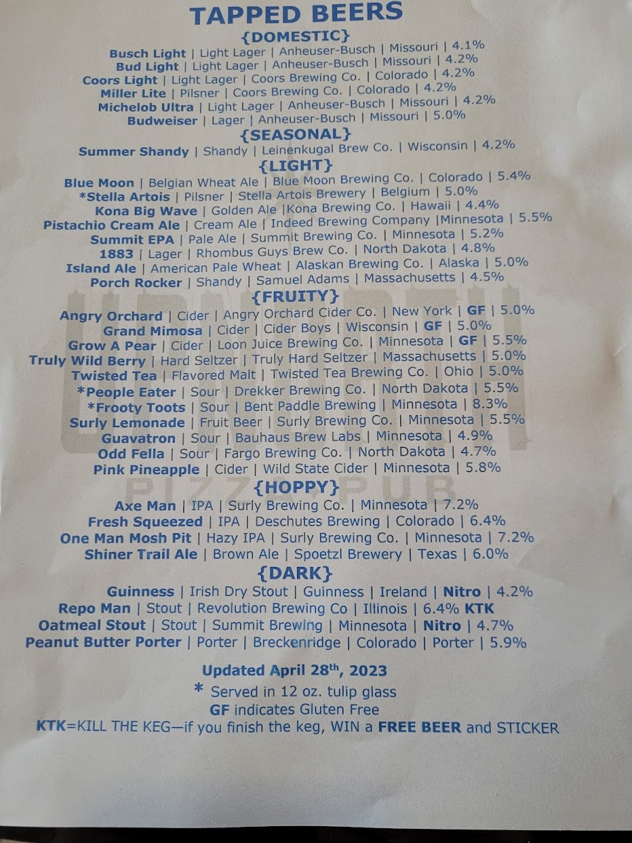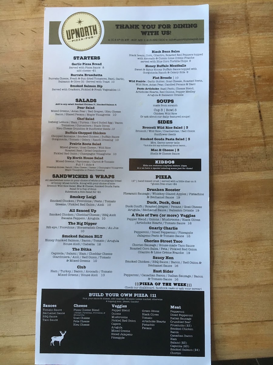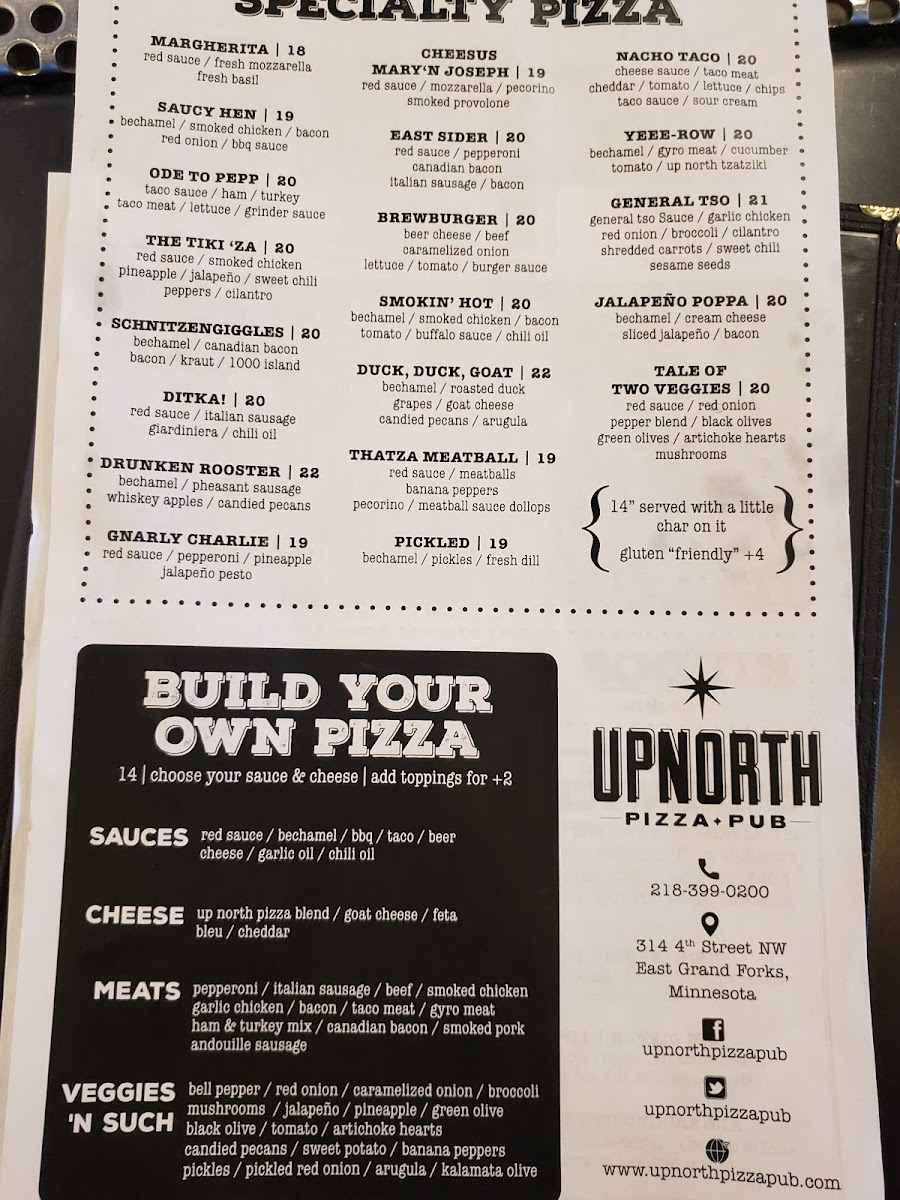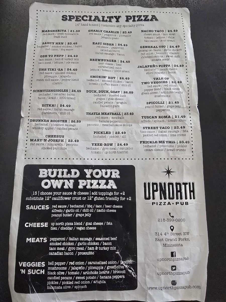 If you're in the mood for a cozy spot to grab some delicious food in East Grand Forks, look no further than Up North Pizza Pub Menu. Nestled at 314 4th St NW, this local gem offers a mouthwatering selection of pizzas that will make you want to come back for more. Whether you're a fan of classic toppings or like to try something a little different, the variety here has something for everyone. Pair that with their fun, laid-back atmosphere, and it's the perfect place to kick back with friends or family. The menu is full of tempting options that go beyond just pizza too-there are plenty of appetizers and drinks to enjoy. Whether you're here for a quick bite or a leisurely meal, Up North Pizza Pub hits the spot every time.