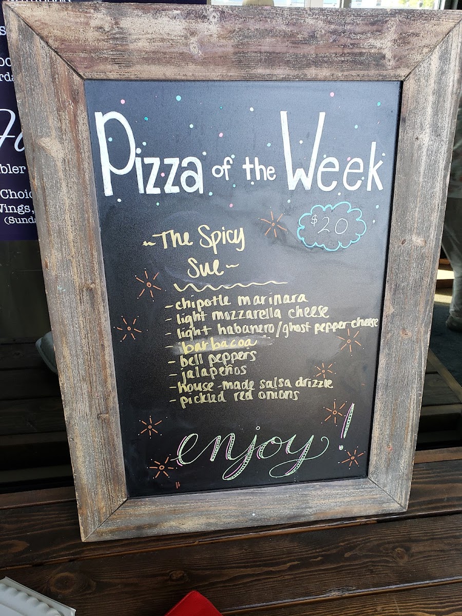 Red sauce, smoked chicken, pineapple, jalapeno, sweet chili, peppers, cilantro. Served with a little char on it.